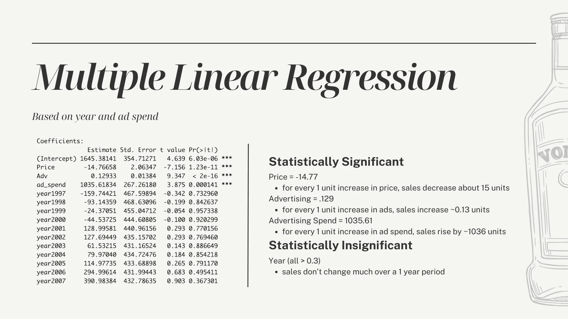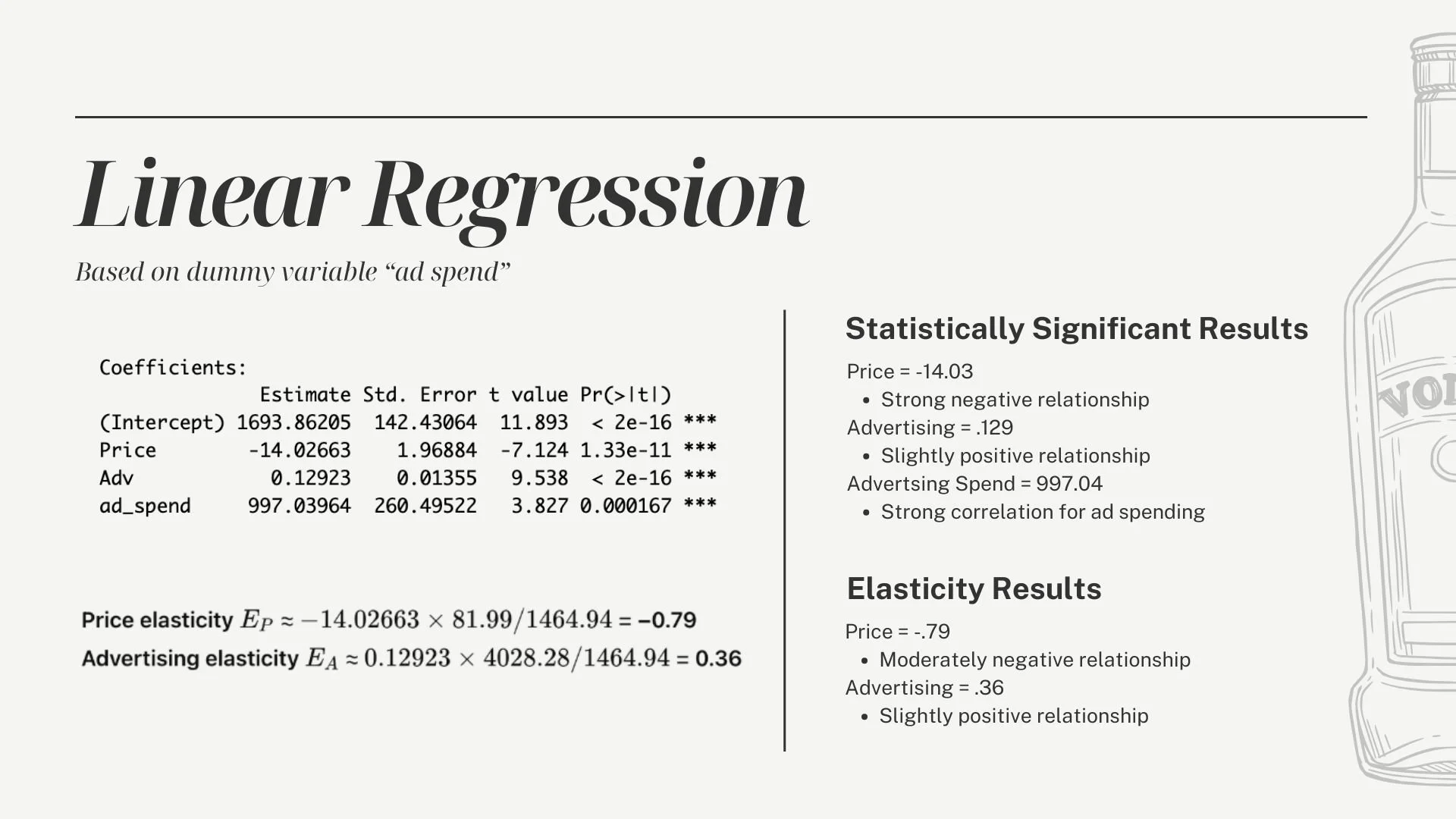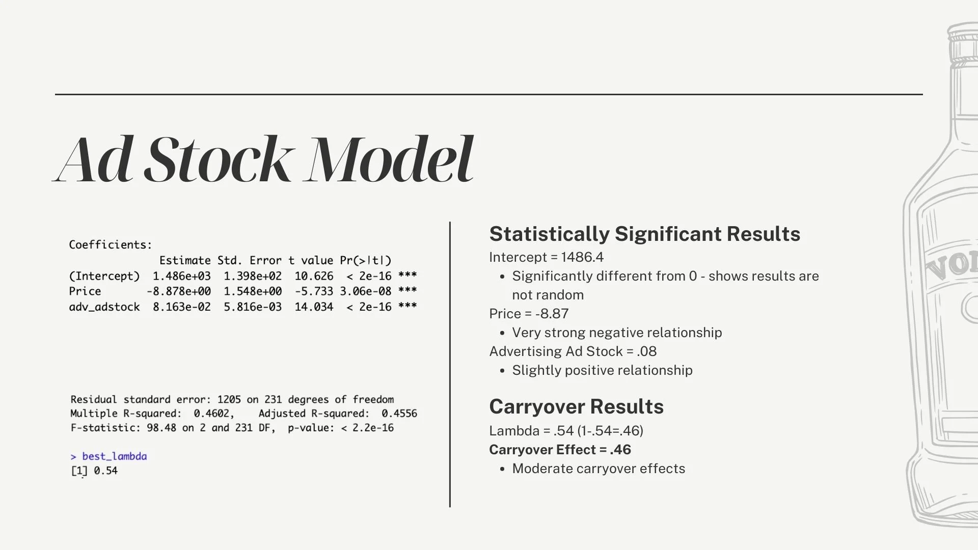 Approach: Applied regression and adstock model to a vodka sales dataset to evaluate the impact of advertising spend on sales volume. Tested multiple model types, including linear regression and log-log models to find the best fit. The adstock model proved to be the strongest fit for the data, accounting for the lagged and cumulative effects of advertising over time.