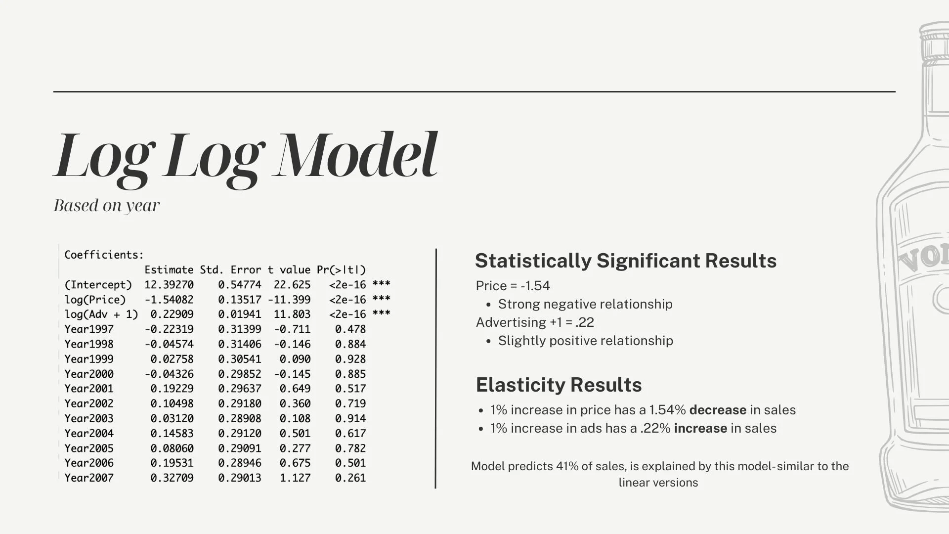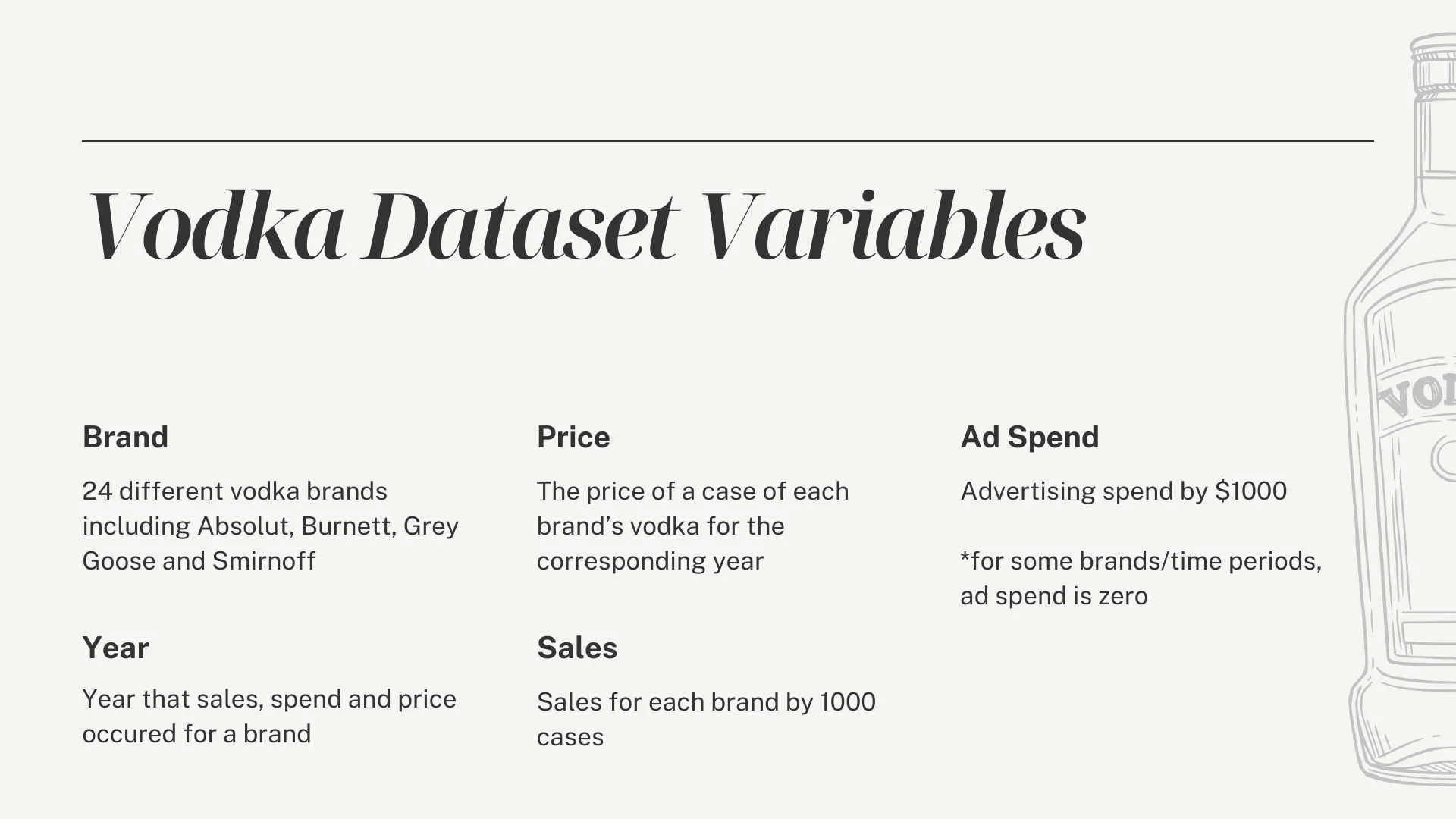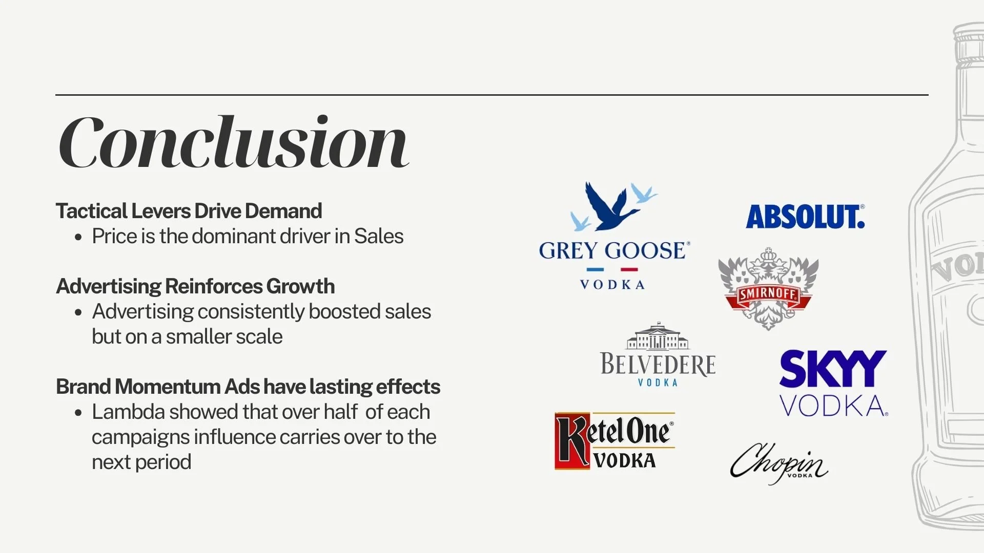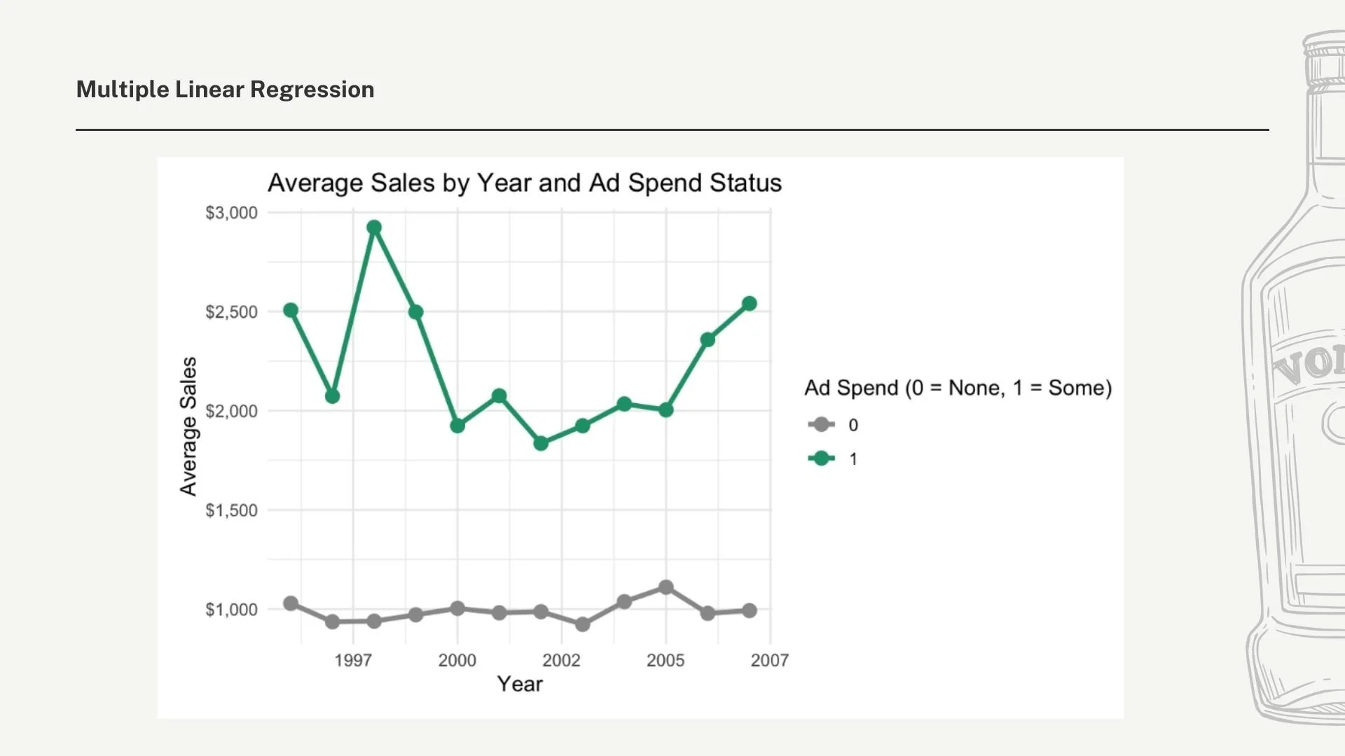 Approach: Applied regression and adstock model to a vodka sales dataset to evaluate the impact of advertising spend on sales volume. Tested multiple model types, including linear regression and log-log models to find the best fit. The adstock model proved to be the strongest fit for the data, accounting for the lagged and cumulative effects of advertising over time.