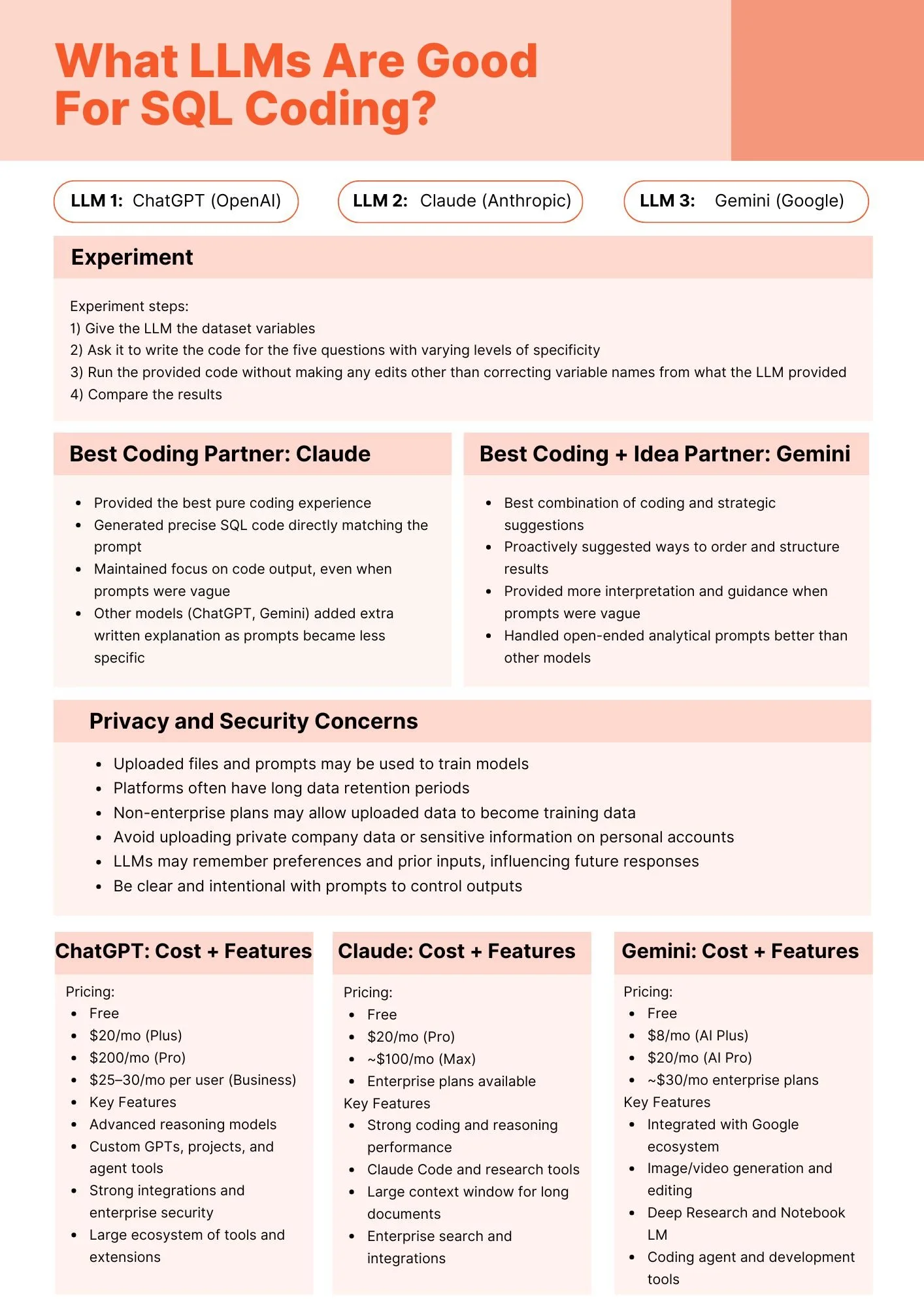 Approach: Tested multiple LLMs on their ability to generate correct SQL code, evaluating accuracy and reliability across a range of query types. The project reflects a hands-on approach to understanding how AI tools can augment analytical workflows.