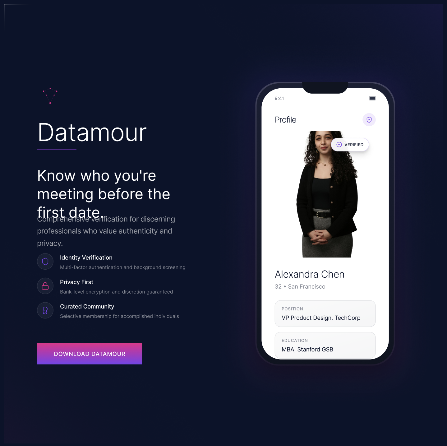 Positioned Datamour around privacy and vetting to reinforce professionals’ existing belief that traditional dating apps are risky and poorly screened.